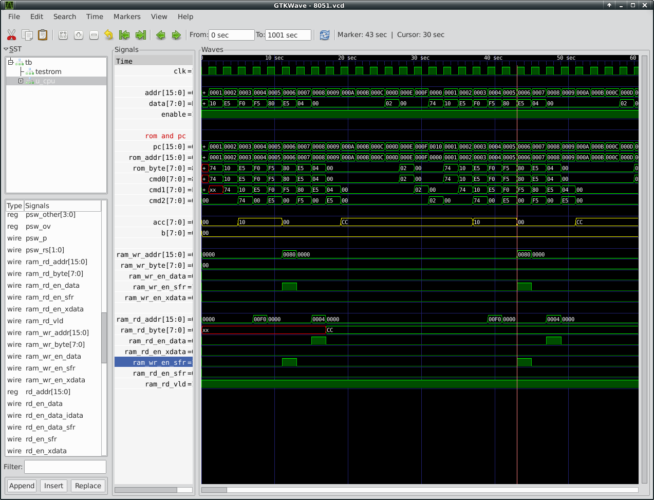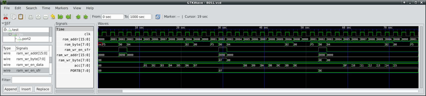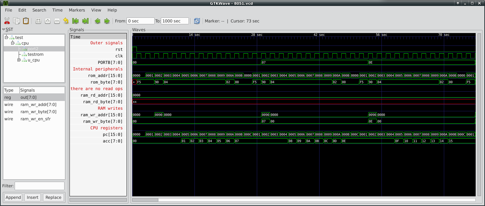 From the top there is the CPU clock, then goes the ROM address that is being read and the ROM data (the instruction). Below that, ram_wr_en_sfr indicates a write to an SFR at the address specified by ram_wr_addr of the value ram_wr_byte. You can see that on the rising edge of ram_wr_en_sfr the value of Accumulator (acc) is copied to ram_wr_byte and appears on PORTB output.