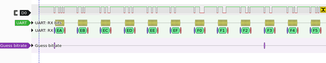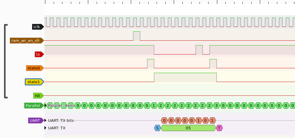 In the image above all important signals from the UART perupheral were carried out to the FPGA's physical output pins. tx is the output of the UART, state0 and state1 are the FSM state bits (also decoded with the Paralell decoder on the bottom. The tx line is decoded with pulseview's UART decoder, showing a transmitted 0x05 bit