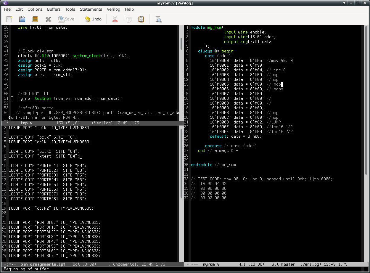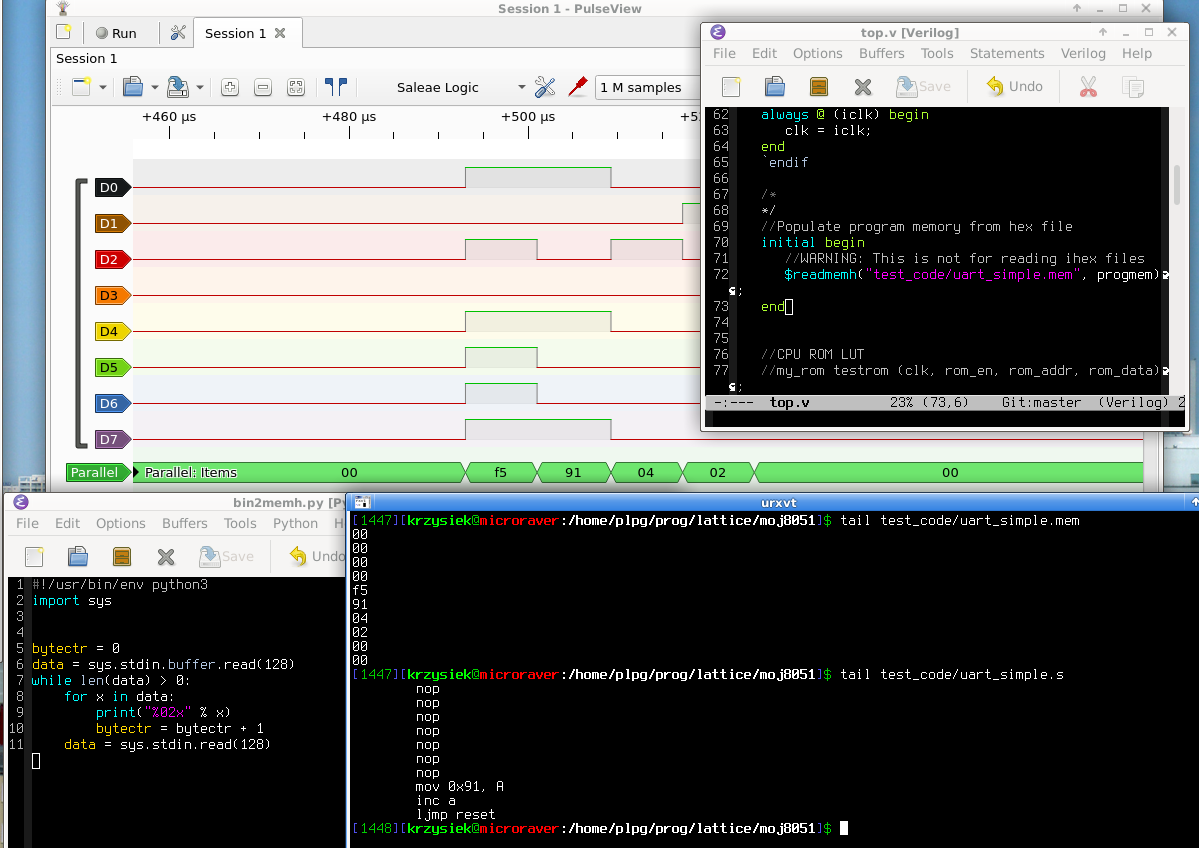I wanted to try some software core on the FPGA. I chose 8051 because it's a simple CPU and the machine code can be written by hand. I found two Verilog implementations: